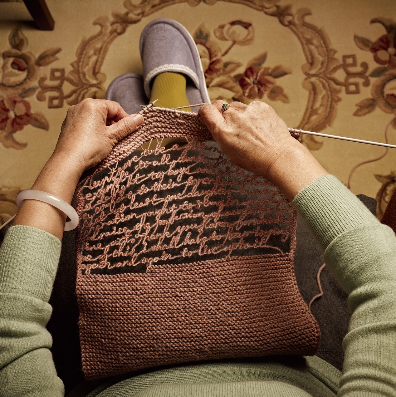 Wonderful way of making the idea of listening to audio books while knitting visualized through "knitted" text. So cosy. :)